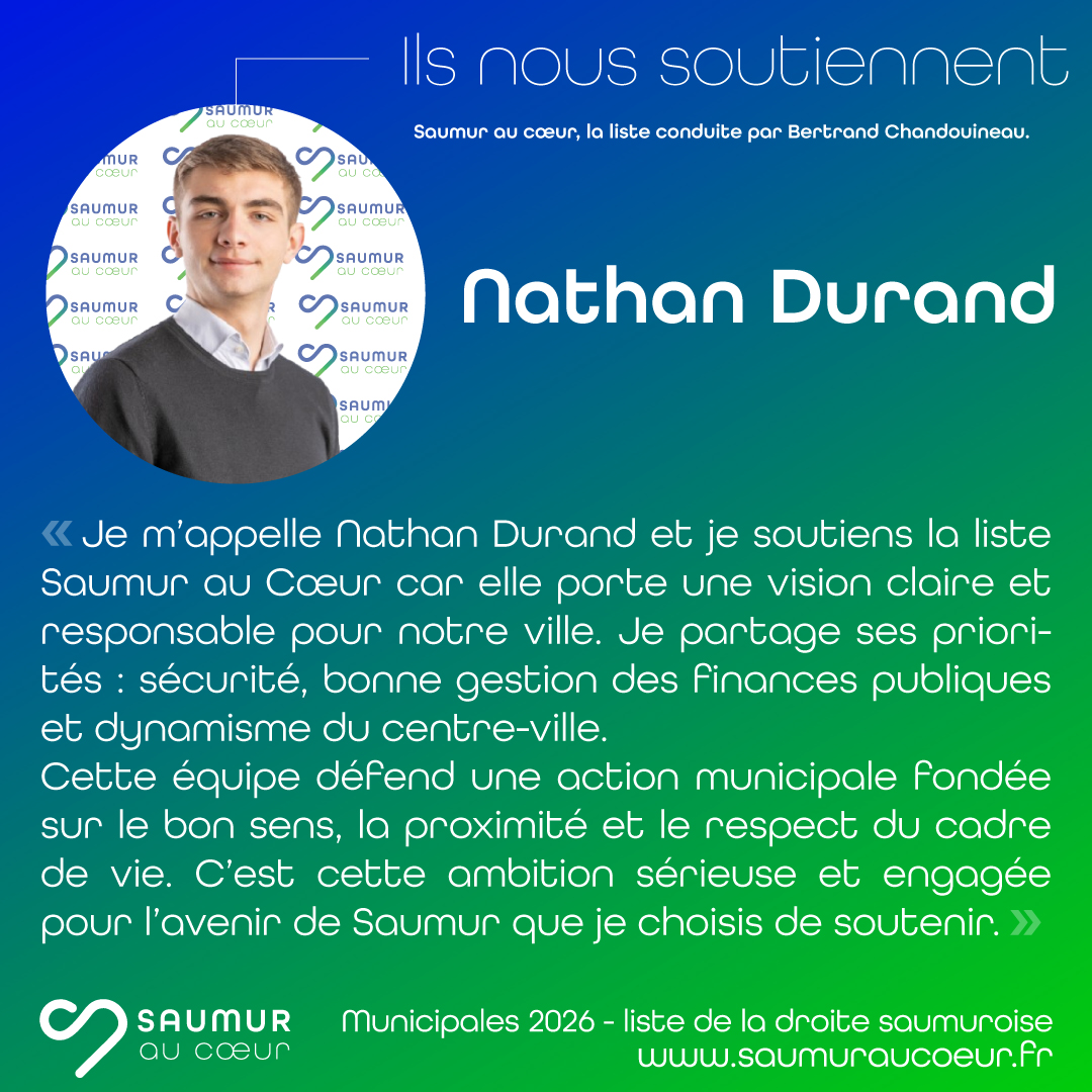 « Je m’appelle Nathan Durand et je soutiens la liste Saumur au Cœur car elle porte une vision claire et responsable pour notre ville. Je partage ses priorités : sécurité, bonne gestion des finances publiques et dynamisme du centre-ville.