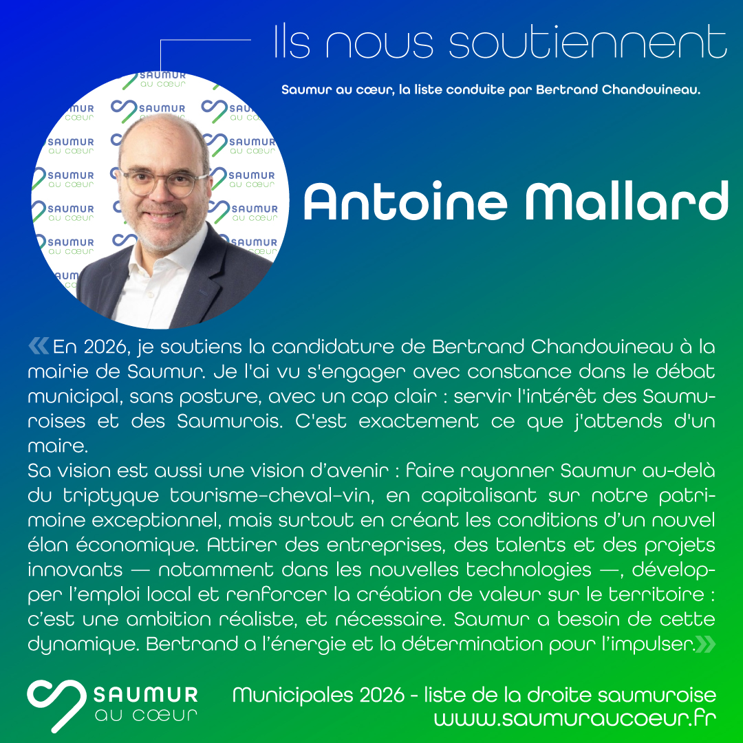 Antoine Mallard, associé dans un fond d’investissement, saumurois passionné, apporte son énergie à notre liste conduite par Bertrand Chandouineau.