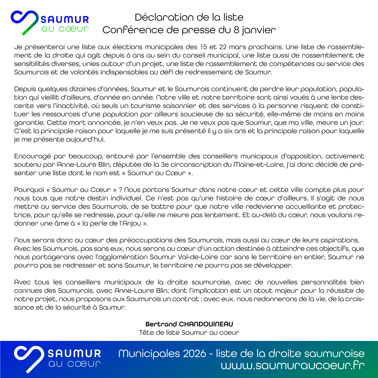 « En 2026, soutenons la droite saumuroise. Bertrand Chandouineau c’est un cap clair, qui sert l’intérêt des Saumurois. Oui au tourisme créatif et innovant, en partenariat avec notre pôle économique. Attirons les entreprises, les talents et les projets locaux ! Renforçons notamment les nouveautés technologiques sur notre territoire et développons l’énergie et la détermination saumuroise ».